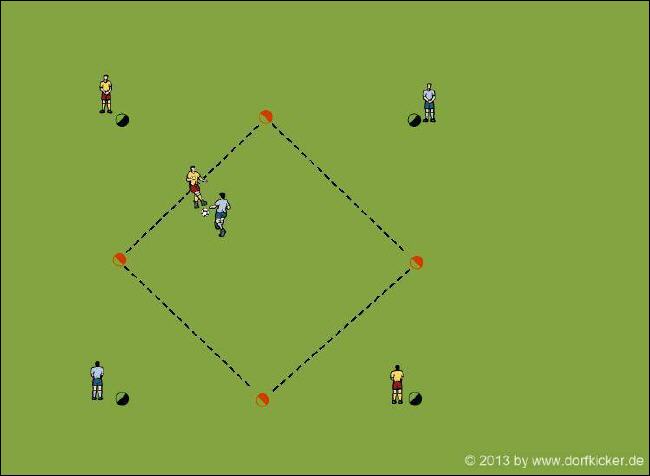 Jeweils gegenüber stehen sich die Spieler einer Mannschaft, die Startposition wird doppelt besetzt (mit Ball), im inneren Viereck wartet der Gegenspieler.